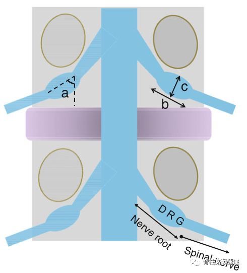 图注:测量背根神经节角度(a)、背根神经节长度(b)、背根神经节宽度(c)示意图