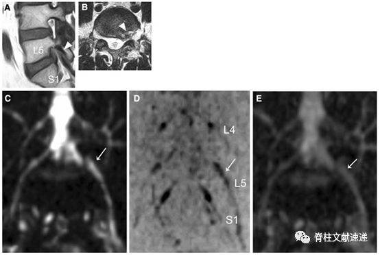 图注:47岁患者,L5/S1椎间盘突出。箭头显示L5椎间孔狭窄,神经周围脂肪信号消失。B图T2加权像,箭头显示孔内左侧椎间盘突出。E根据冠状面计算ADC图。箭头所示为神经根肿胀和凹陷。