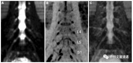 图注:健康志愿者腰椎神经根冠状扩散加权图像(DWI)。L4、L5和S1表示腰4、5骶1神经根。C图是基于DWI计算得到的ADC图。
