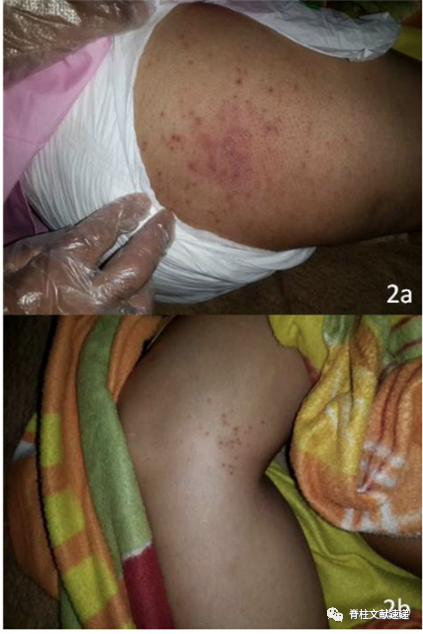 到手术室后才发现患者右侧臀部和膝盖处水泡、破溃和红斑,如下图。咨询了皮肤科医师诊断为带状疱疹。我们结合MR认为可能是带状疱疹与椎间盘突出并存,仍准备进行手术治疗。再次通过PACS系统查看MR时发现存在存在同名同姓患者,MR并非我们该患者的结果,而该患者MR是完全正常的!!随停止手术,给予阿昔洛韦、加巴喷丁治疗,10天后症状明显缓解,3月后完全缓解。