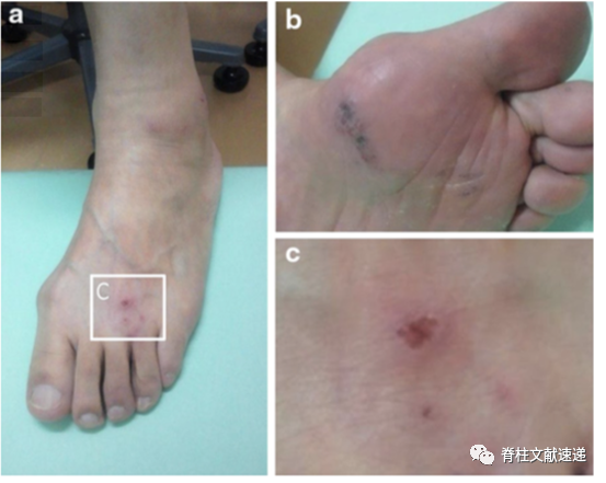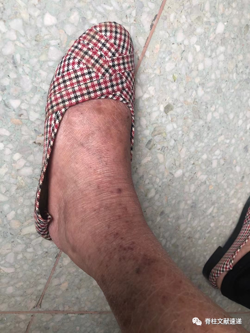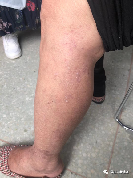 最近就诊病人中存在的坐骨神经带状疱疹患者。中年女性,左侧小腿和足面疼痛20天,夜间痛明显,查体直腿抬高试验阴性,可见膝关节及小腿外侧和足踝部水泡和皮损痕迹,追问病史得知疼痛后4天曾起水泡和皮肤破损,见下图。给予抗病毒和加巴喷丁治疗。1周后症状缓解。
