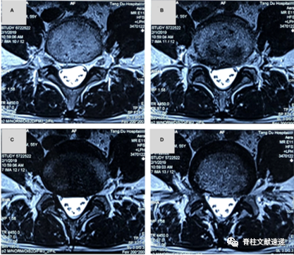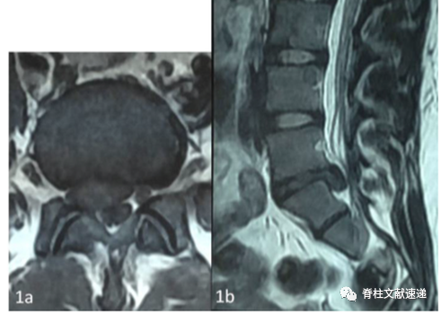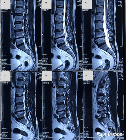 该文献报道了一例21岁女性患者,以腰背部疼痛伴右下肢放射痛,尿失禁3天为主诉。右侧直腿抬高试验阳性(<20度)。右侧拇长伸肌和胫骨前肌力量下降。患者既往淋巴瘤曾进行5次化疗,安排进行了MR检查,如下图。随即安排了手术。