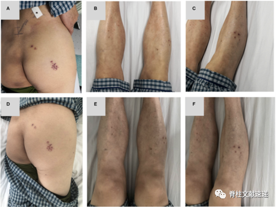 入院3天后,查体见患者右侧臀部和右小腿的疱疹样皮损,如下图所示。咨询皮肤科后诊断坐骨神经带状疱疹,给予抗病毒治疗,3天后症状减轻,3月后症状完全缓解。