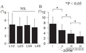 图示:平均矫正角度。A)融合节段水平与校正角度之间的无显著差异性。B)cage的位置越靠前,矢状前凸就越明显。