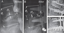 图示:A, B) OLIF手术前后的对比图。矢状位矫正良好,椎管扩大间接减压。C为Ⅰ区,D为IV区。