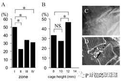 图示:终板损伤发生率。A) Ⅰ区域最容易受伤。II区损伤最少。B) 12毫米的cage高度与大多数损伤显著相关。