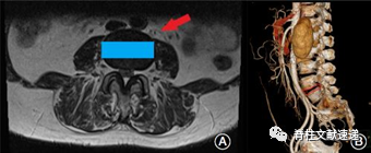 图示:(A)箭头表示到手术入路间隙,矩形表示cage的位置。MRI横截面决定了是否适合进行OLIF手术。(B) CTA检查是否有异常的血管畸形,降低血管损伤的发生率。