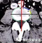 图示:L3-4椎间隙水平面。O:椎间隙中心;AC:血管窗;CD:裸露窗;BD:腰大窗;BE:左腰大肌宽度;理想手术窗=血管窗(AC)+裸露窗(CD)+腰大窗(BD);实际手术窗=裸露窗(CD)+腰大肌肌窗(BD)。