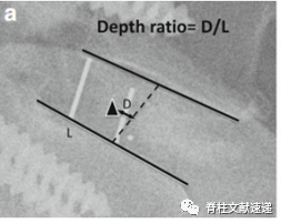 图注:如图a所示深度比在侧位X线片上测量cage中心点与椎间盘中心(头端和尾端椎板中点之间的连线)之间的距离除以尾端椎板长度。cage放置位置靠前时,该值定义为正数,cage放置位置靠后时,该值定为负数;