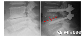 图注:上图为术后即刻X线片,下图为术后3个月X线片,可以看出该患者术后3个月时cage移位到了椎管内,即发生了cage退回(CR)。