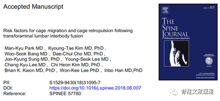3.Park MK,Kim KT,Bang WS,et al.Risk factors for cage migration and cage retropulsion following transforaminal lumbar interbody fusion.Spine J 2019;19:437-447.PMID:30142459.