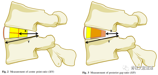 图注:所有cage内部均有标记cage位置的金属标志,通过该标志可以确定cage的中心点。然后计算出CPR和PGR,左图为中心点比率(CPR)计算方法:cage中点至下椎体后边缘的长度(X)除以下椎体上终板的长度(Y),CPR值小于0.5表示笼子放置在椎间盘间隙的后部,而值大于0.5表示笼子放置在椎间盘的前部。右图为后间隙比(PGR)计算方法:cage后壁至下椎体后边缘的长度(X)除以下椎体上终板的长度(Y),该比率不仅表明笼子位置(比率越大,笼子越靠前),也间接表明笼子的长度。