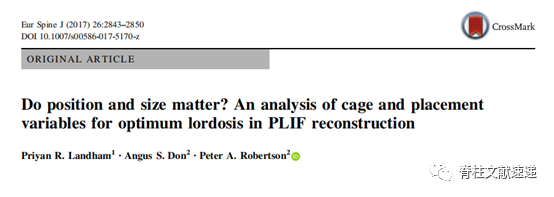 1.Landham PR,Don AS.Do position and size matter?An analysis of cage and placement variables for optimum lordosis in PLIF reconstruction.Eur Spine J 2017;26:2843-2850.PMID:28620787.https://www.ncbi.nlm.nih.gov/pubmed/28620787.