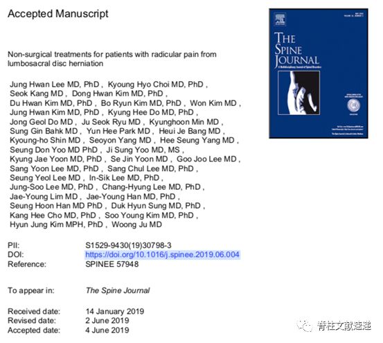 1.Lee Jung Hwan,Choi Kyoung Hyo,Kang Seok et al. Nonsurgical treatmentsfor patients with radicular pain from lumbosacral disc herniation.[J] .Spine J,2019, 19: 1478-1489.