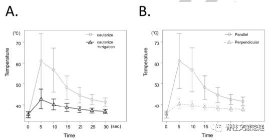 结论:使用双极在神经根附近烧灼可使神经根温度升高,引起神经根热损伤。采用盐水冲洗或双极钳垂直于神经根,可以抑制热升高,防止神经根损伤。因此,建议外科医生将双极电凝垂直于神经根放置,或使用盐水冲洗以预防神经根损伤。局部注射皮质类固醇防止神经热损伤不够有效。