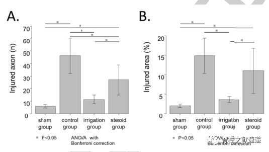 局部注射皮质类固醇的效果:虽然损伤轴突的平均数(26.8±11.1)显著低于对照组(p < 0.01),但相比仍然显著高于假手术组(p < 0.01)。