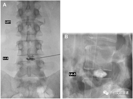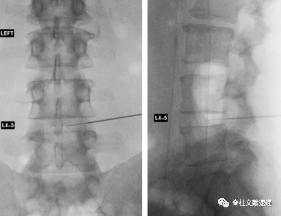 4.1. 俯卧位,常规消毒,定位。将穿刺针置入髓核区域,正位片上接近中线,侧位片上亦接近椎间盘中央。