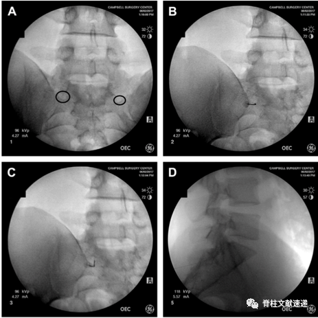 2.1. 俯卧位,常规消毒,定位,正位时调整C臂机,与L5/S1椎间隙平行,黑圈所示为骶1孔,后孔易与较大的前孔混淆(上图A)