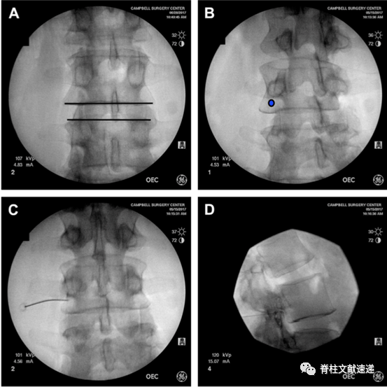 1.1俯卧位,常规消毒,定位,正位时调整C臂机,使目标椎间隙平行(上图A)