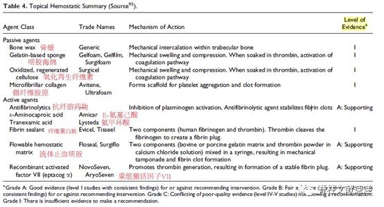 图注:局部止血最常用的药物及其疗效(最后一栏为证据等级)。