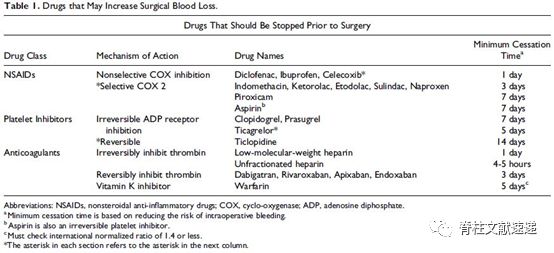 (一)非甾体类抗炎药:最常见的药物是非甾体抗炎药(NSAIDs),包括阿司匹林(乙酰水杨酸[ASA])、布洛芬、萘普生和塞来昔布。这些药物抑制环氧合酶(COX)酶,减少血栓素A2(TXA2)的产生,而血栓素A2是血小板激活和聚集的关键上游触发因素。尽管传统建议在围手术期停止,但仍然没有关于最佳的停止时间的实际指南。大多数建议是基于这些药物的半衰期,然而在脊柱外科领域缺乏高质量的证据来建议最佳的停药时间。