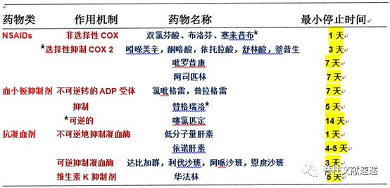 图注:手术前应该停用的药物及其时间(*每一节的星号是指下一栏的星号,如塞来昔布是选择性抑制COX-2;替格瑞洛是可逆的ADP受体)。