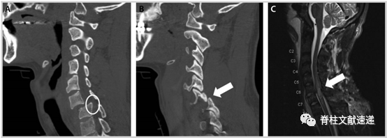 图注:图A、B为C6-7脱位的CT结果,图C为MRI的T2加权像结果显示以C6-C7为中心的外伤性脊髓损伤, C5至T1均存在不同程度的脊髓信号异常。