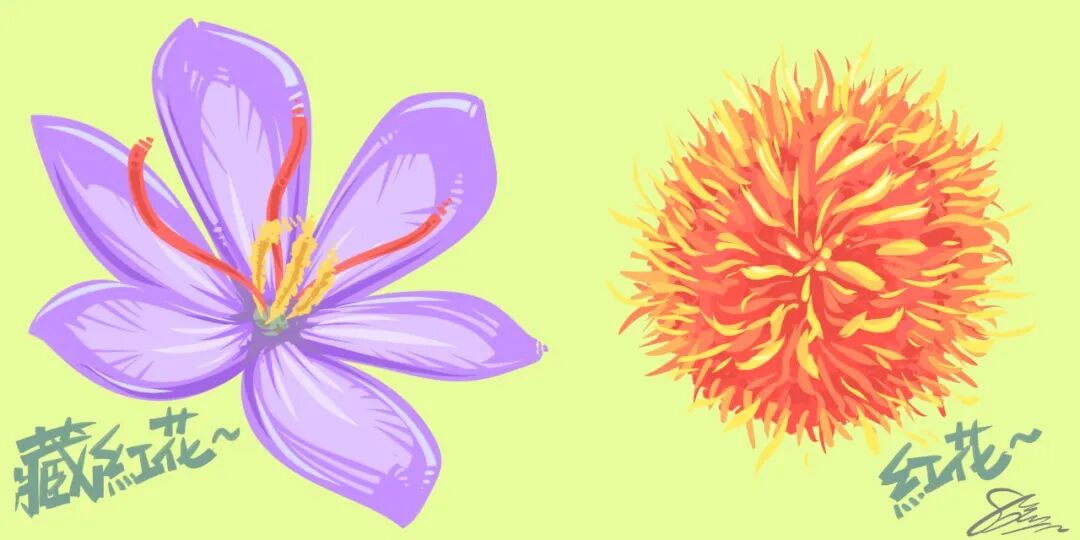 相信大家看到红花,心里想到的一定是比它名气更大的藏红花。而事实上红花和藏红花虽仅一字之差,却是完全不同的两种药物,如下图,大家也能清楚的看到两种药用植物的不同。