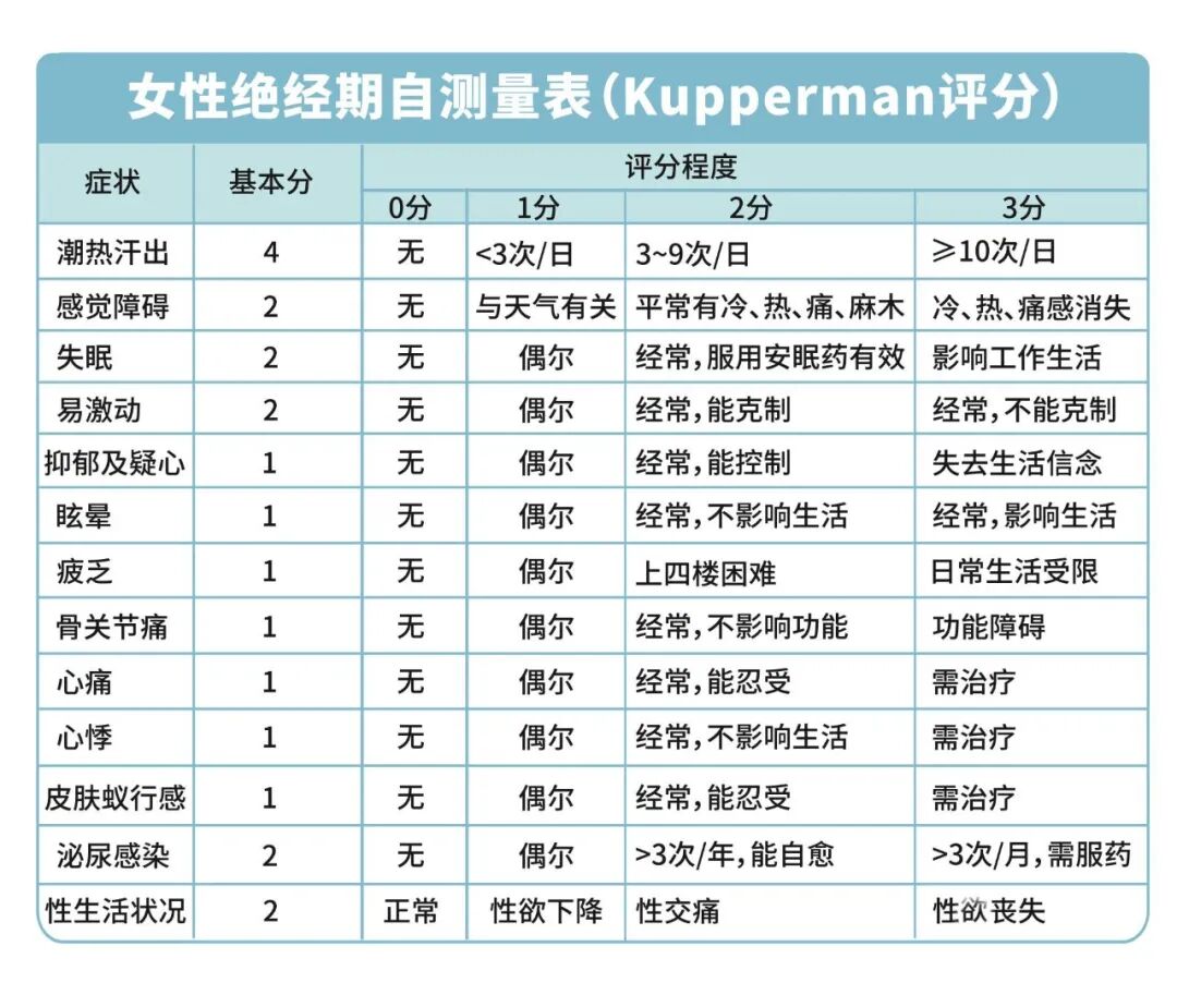 如果这么说,您还是觉得有些模棱两可,那我们一起来做个测试,Kupperman评分是国际上公认的,评价“经断前后诸证”严重程度的标准:
