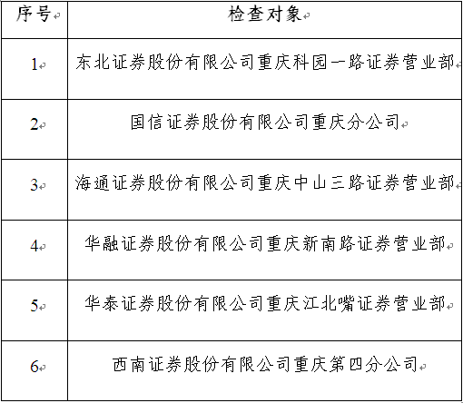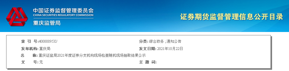 重庆证监局于2021年10月15日完成2021年度证券分支机构现场检查随机现场抽取工作。抽取工作按照相关规定执行,在我局纪检监察办公室工作人员现场监督下抽取,现将随机抽取结果公示如下: