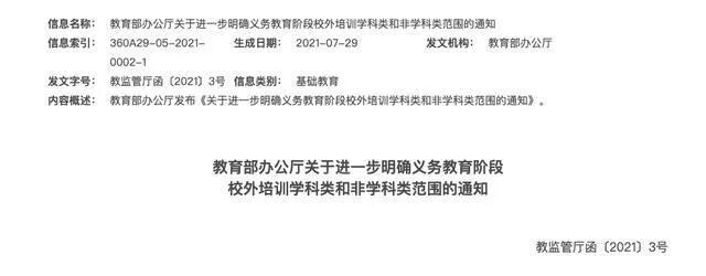 7月30日,教育部官网发出通知,进一步明确义务教育阶段校外培训学科类和非学科类范围。