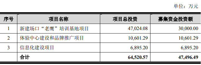 老鹰股份本次拟公开发行新股数量不超过1250万股,公开发行的股份占发行后公司总股本的比例不低于25%,拟融资金额4.7496亿元,主要用于投资如下项目: