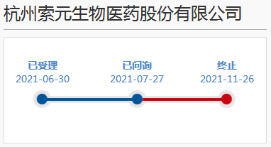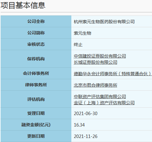 2021年11月25日,杭州索元生物医药股份有限公司因发行人撤回发行上市申请或者保荐人撤销保荐。根据《审核规则》第六十七条(二),上交所终止其发行上市审核。