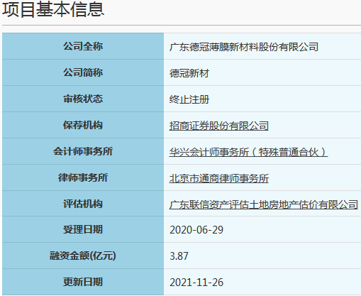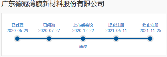 2021年11月18日,你公司和保荐机构招商证券股份有限公司提交了《广东德冠薄膜新材料股份有限公司关于撤回首次公开发行股票并在科创板上市申请文件的申请》(总字[2021]第【65】号)和《招商证券股份有限公司关于撤回广东德冠薄膜新材料股份有限公司首次公开发行股票并在科创板上市申请文件的申请》(招证发[2021]666号),主动要求撤回注册申请文件。