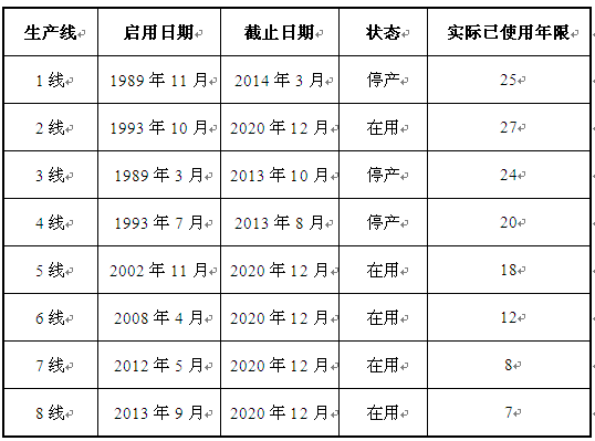 截至2020年12月31日,发行人各条生产线的实际使用年限如下表所示: