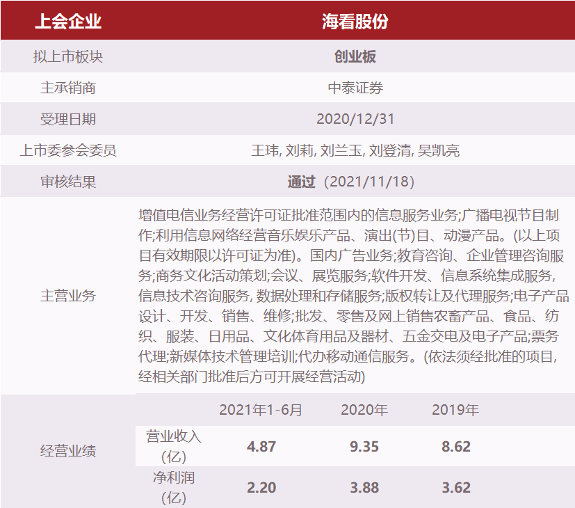 (3)关联交易:2018年至2021年1-6月,海看股份向关联方采购商品/接受劳务发生的关联交易金额分别为2014.27万元、3029.10万元、2426.78万元和1257.93万元,占公司营业总成本的比重分别为5.03%、6.61%、4.60%和5.03%;公司向关联方销售商品/提供劳务发生的经常性关联交易金额分别为997.03万元、705.91万元、654.34万元和283.02万元,占公司营业收入的比重分别为1.43%、0.82%、0.70%和0.58%。