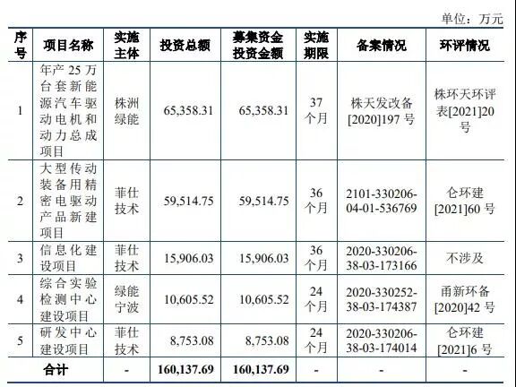 本次IPO菲仕技术拟募资16.01亿元,将用于年产25万台套新能源汽车驱动电机和动力总成项目、大型传动装备用精密电驱动产品新建项目、信息化建设项目、综合实验检测中心建设项目及研发中心建设项目。