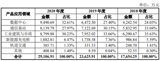 报告期内,按照产品应用领域划分,公司主营业务收入主要来源于数据中心、通信基站、工业建筑与市政领域,具体情况如下: