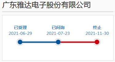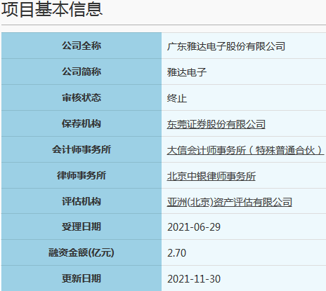 2021年6月29日广东雅达电子股份有限公司申请上市获科创板受理,2021年11月29日,因发行人撤回发行上市申请或者保荐人撤销保荐。根据《审核规则》第六十七条(二),上交所终止其发行上市审核。