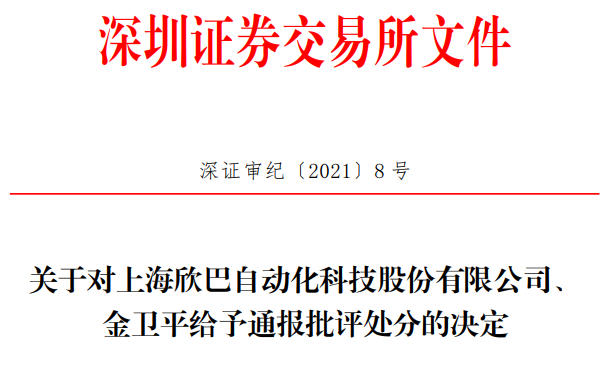 二、对上海欣巴自动化科技股份有限公司实际控制人、董事长、法定代表人金卫平给予通报批评的处分。