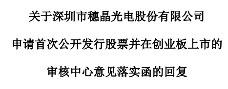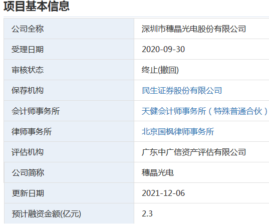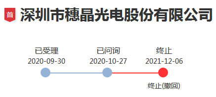 2021年11月27日,深圳市穗晶光电股份有限公司申请撤回发行上市申请文件。根据《深圳证券交易所创业板股票发行上市审核规则》第六十七条,深交所决定终止对其首次公开发行股票并在创业板上市的审核。
