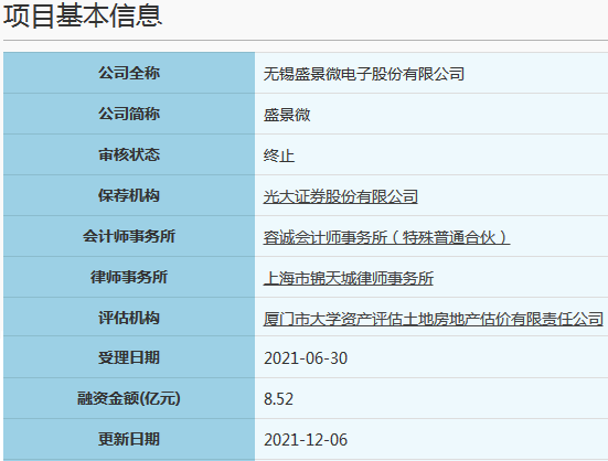 2021年12月03日,无锡盛景微电子股份有限公司因发行人撤回发行上市申请或者保荐人撤销保荐。根据《审核规则》第六十七条(二),上交所终止其发行上市审核。