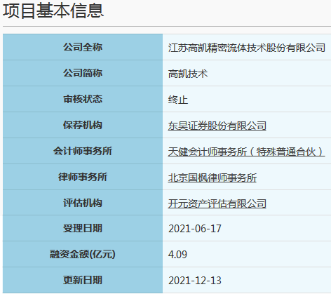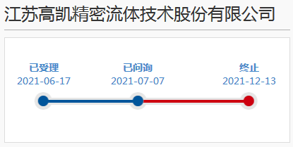 2021年12月10日,江苏高凯精密流体技术股份有限公司因发行人撤回发行上市申请或者保荐人撤销保荐。根据《审核规则》第六十七条(二),上交所终止其发行上市审核。