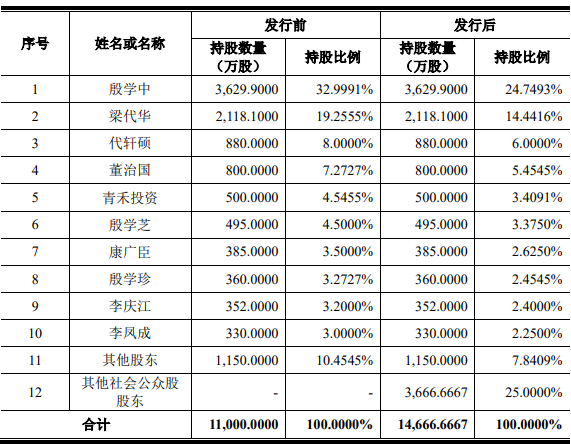 殷学中直接持有公司 36,299,000 股股份,占发行前总股本的 32.9991%;梁代华直接持有公司 21,181,000 股股份,占发行前总股份的 19.2555%。殷学中与梁代华系夫妻关系,合计直接持有公司发行前总股本的 52.2545%,为公司的控股股东。殷学中和梁代华夫妇合计直接和间接持有公司 54.0430%的股份,为公司的实际控制人。