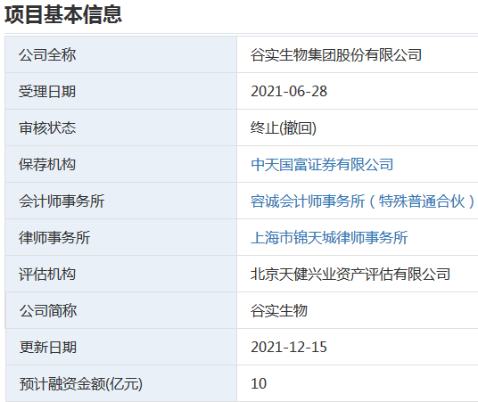 2021年12月10日,谷实生物集团股份有限公司申请撤回发行上市申请文件。根据《深圳证券交易所创业板股票发行上市审核规则》第六十七条,深交所决定终止对其首次公开发行股票并在创业板上市的审核。