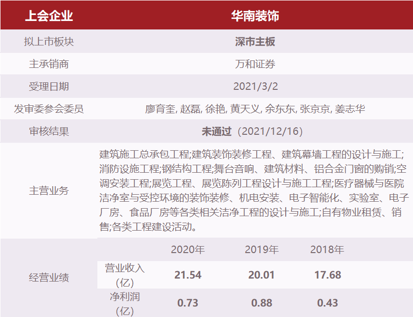值得一提的是,这是华南装饰第三次冲击IPO。2017年11月17日,因辅导团队人员调整,华南装饰与网信证券签订了上市辅导终止协议。2020年5月19日,受疫情等不可抗力因素影响,华南装饰与英大证券公告,就终止辅导达成一致。