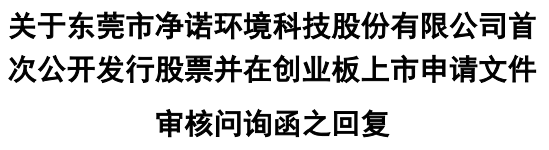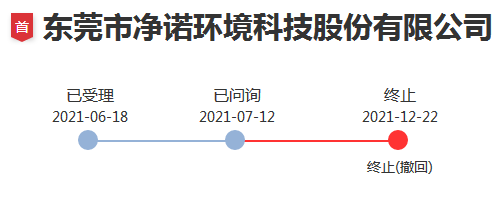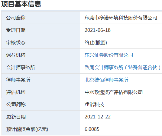 2021年12月20日,东莞市净诺环境科技股份有限公司申请撤回发行上市申请文件。根据《深圳证券交易所创业板股票发行上市审核规则》第六十七条,深交所决定终止对其首次公开发行股票并在创业板上市的审核。