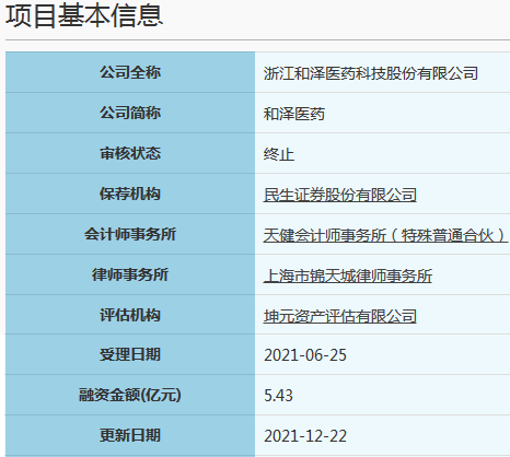 2021年12月21日,浙江和泽医药科技股份有限公司因发行人撤回发行上市申请或者保荐人撤销保荐。根据《审核规则》第六十七条(二),上交所终止其发行上市审核。