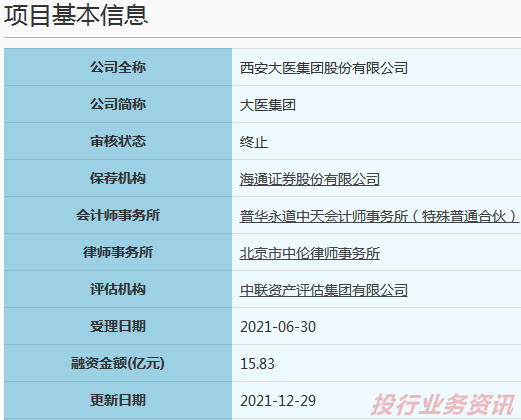 2021年12月29日,西安大医集团股份有限公司因发行人撤回发行上市申请或者保荐人撤销保荐。根据《审核规则》第六十七条(二),上交所终止其发行上市审核。