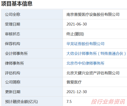 2021年12月28日,南京普爱医疗设备股份有限公司申请撤回发行上市申请文件。根据《深圳证券交易所创业板股票发行上市审核规则》第六十七条,深交所决定终止对其首次公开发行股票并在创业板上市的审核。